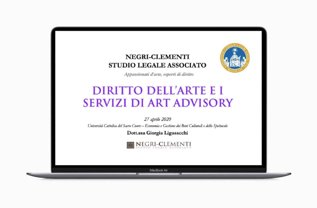 Lunedì 27 aprile 2020 si è tenuta la lezione webinar “Diritto dell’Arte e i servizi di Art Advisory”, organizzato dalla Professoressa Alessia Anzivino, docente dell’Università Cattolica del Sacro Cuore di Milano, per gli studenti del corso triennale di Economia e Gestione dei Beni Culturali e dello Spettacolo Facoltà di Economia, Lettere e Filosofia.