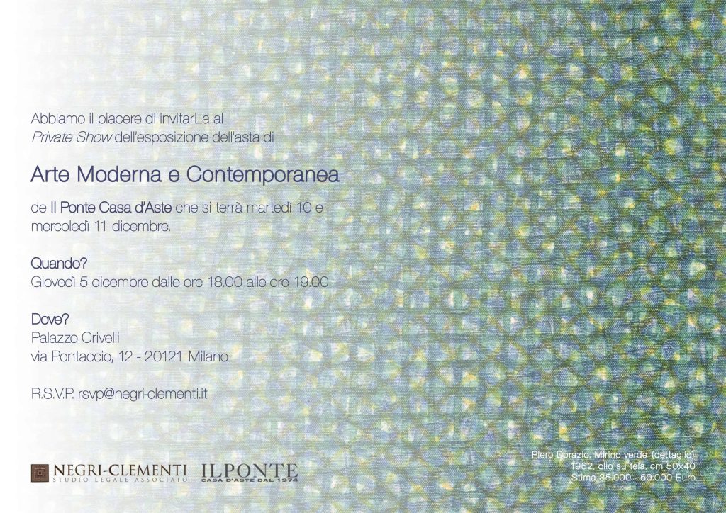Giovedì 5 dicembre alle ore 18 presso Palazzo Crivelli (Via Pontaccio, 12 – 20121 Milano) Negri-Clementi Studio Legale ha organizzato un esclusivo private show dell’esposizione dell’asta di “Arte Moderna e Contemporanea” de Il Ponte Casa d’Aste.